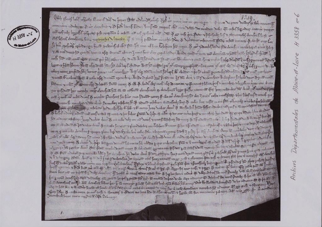Noveritis quod cum esset contentio inter me ex una parte et priorem de Ponte Dinani ex altera revocato propter contencionem in debitum quid esset elemosina et quid foedus laicus, tandem Jocius tunc temporis officialis curie Dolensis de mandato Dolensis episcopi testes super eadem contencione recepit inter nos rebus litigionis inspectis, post receptionem vero testium inter nos composuimus in hunc modum : quod ego concessi priori predicto et successoribus suis et confirmavi omnes elemosinas suas et omnes sesinas elemosinarum in parrochia de Lanvalay quas ab antiquo possederant monachi, secundum quod declararet testimonium predictorum testium juratorum. Quod clausum erat causa hujus composicionis complende apparte fuerunt attestaciones ab officiali predicto, quorum tenor talis fuit : testificati sunt jurati quod Hortus Judicaelis Landec est elemosina monachorum cum maceria que ibi est et cum tota donna sicut extenditur a Rencia usque ad vineam Orhant, que vinea fuit olim Giquel Landec. Ab inde extenditur meta inter elemosinam et feodum laicum sicut lapides ostendunt qui missi sunt inter vineam Orhant et vineam Petri filii Erenbour, usque ad viam. Ab inde sicut via ducit que est inter vineam filii Costart et vineam Osenne mulieris, usque ad lapidem qui missus est pro meta inter Radulphum Bigot et filium Herberti. Et ab inde usque ad viam fontis sicut alius lapis ostendit.