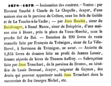 Cette pièce « fiscale » confirme la possession par le dit Jean Houiite de la Maison noble de Broisfrouger ainsi nommé dès 1678.