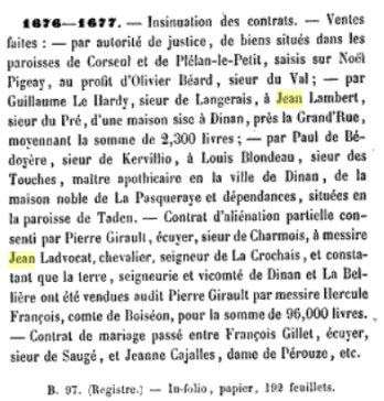 Le dit Pierre Girault pour la somme de 96.000,00 livres s’était en effet porté acquéreur hier de la seigneurie de la Bellière et de la Vicomté de Dinan bien du comte de Boiséon Hercule François ( décédé en février 1692