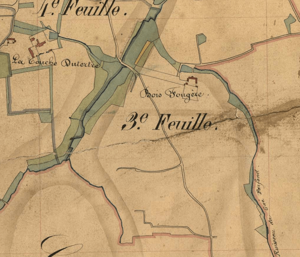 De fait avant de s’écrire « le Bois Fougère » l’appellation du « Boisfrouger » rencontrée dès 1653 sera toujours utilisée à la Révolution française, sera toujours utilisée en 1827, sera toujours utilisée en 1811 ; il faudra en effet attendre l’année 1844 voir voir apparaitre une nouvelle écriture du nom, à savoir l’appellation nouvelle de : « le Bois Fougère ».