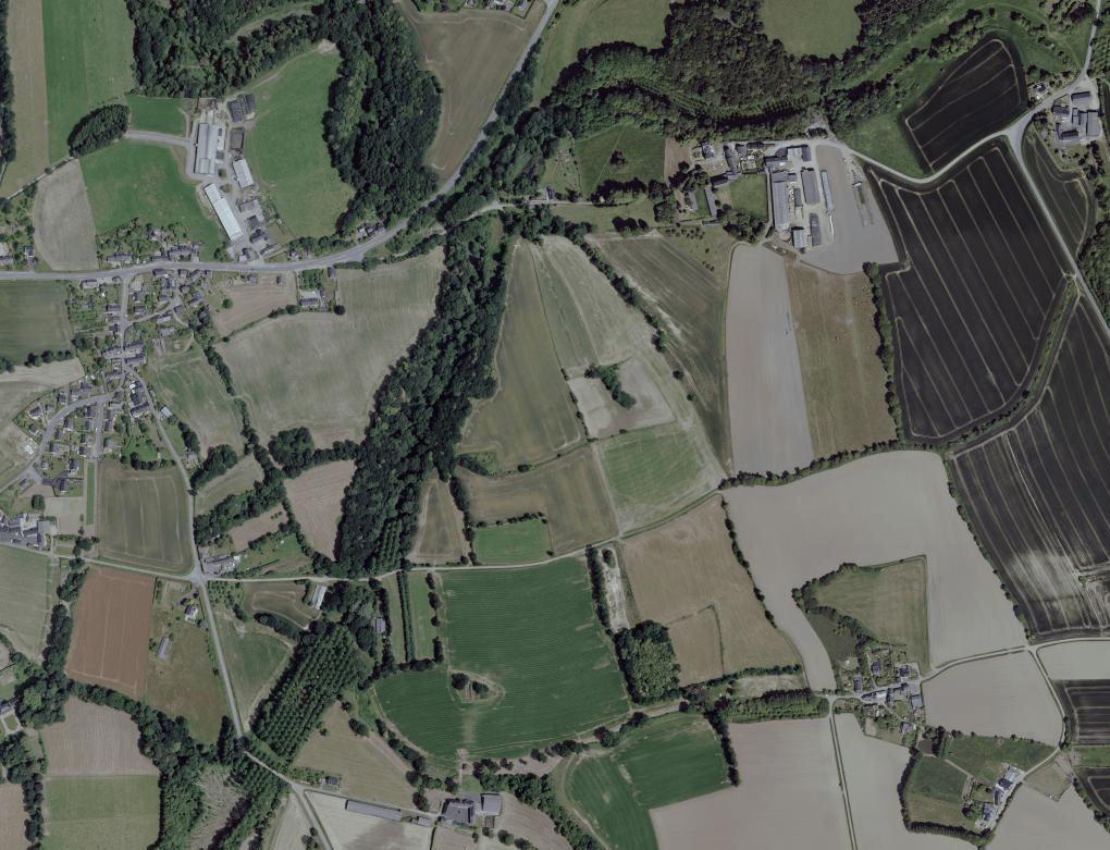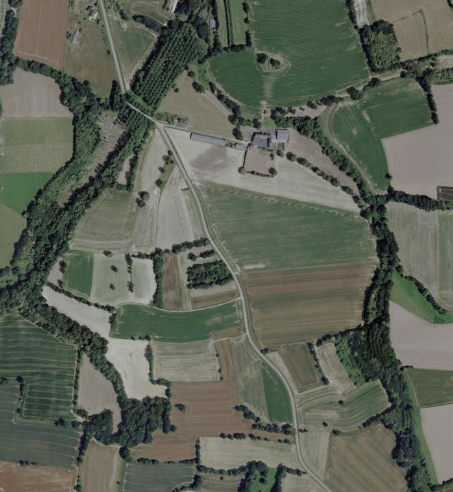 En Saint-Helen l’ancienne métairie du Gué Carousseau citée existante en juillet 1593 est assise au plus haut de l’image, à la droite immédiate de la moitié ; l’ancienne Maison Noble de la Tousche es Russeaux citée en 1473 en Lanvallay, aujourd’hui Bois-fougères, est au plus bas de l’image, à la gauche immédiate de sa moitie.