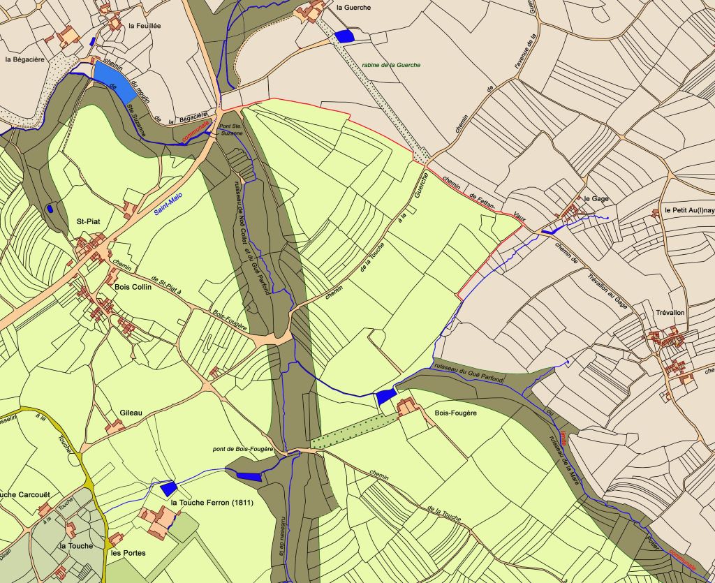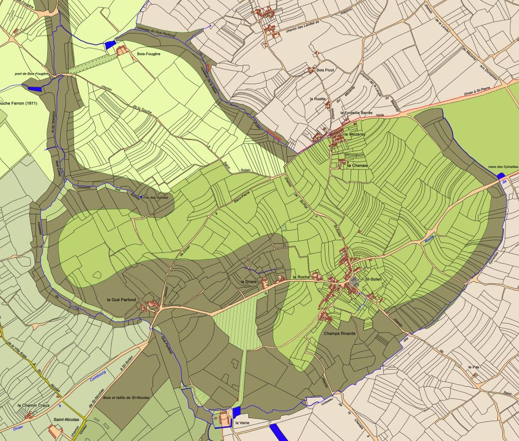 Finalement arrivé à la Vairie ce ruisseau formé de deux branches encercle entièrement en 1844 l’ancienne paroisse de Saint-Solen.