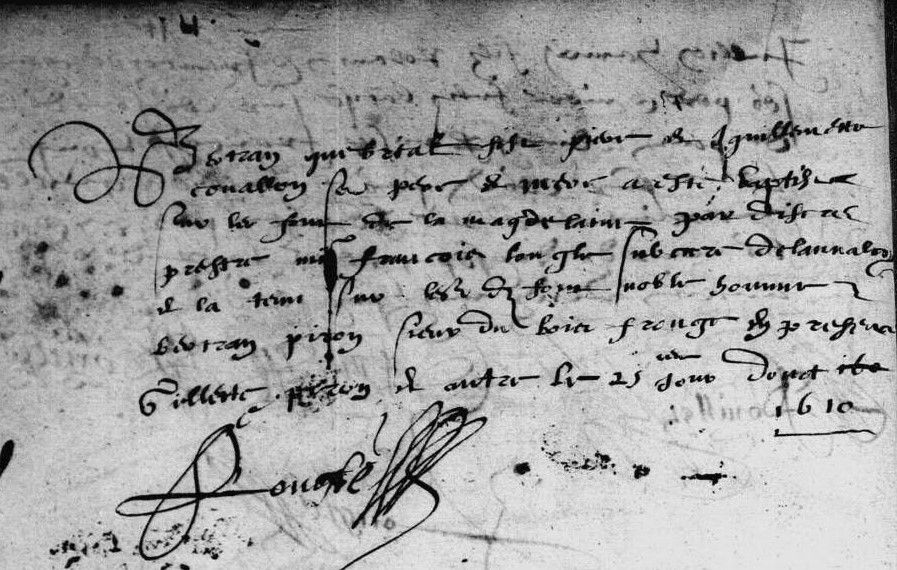 … Bertrand Guebriat fils de Pierre et de Guillemette Ravalleu ses père et mère a esté baptisé sur les fons de la Magdelaine par discret prestre François Longlet subcuré de Lanvallay et la tenu sur les dits fonts noble homme Bertrand Piron sieur du Bois Frouger en presence de Gillette Piron (femme de Claude Leforestier tous deux Sieur et Dame de la Lande Russeaux) et autre le 25 jour d’aoust 1610...