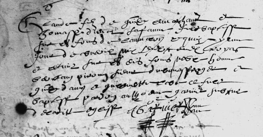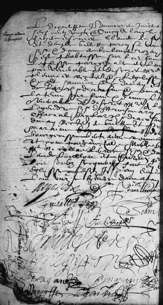 …Renée Desprez fille de Jacques Despretz et de Tiennette Souquet sa femme fut baptisée en l’église de la Magdelaine du pont a Dinan par Messire Thomas Levasseur curé de Lanvallay et mis sur les fondz par escuyer René Piron sieur des Landes Boisfrouger assisté de Michelle Ouyces femme de Jacques Botuel aux presences dudit Jacques Desprez père de ladite Renée, des soubz signez et de plusieurs autres le vingt sixiesme jour de janvier mil six cenz vingt sept.