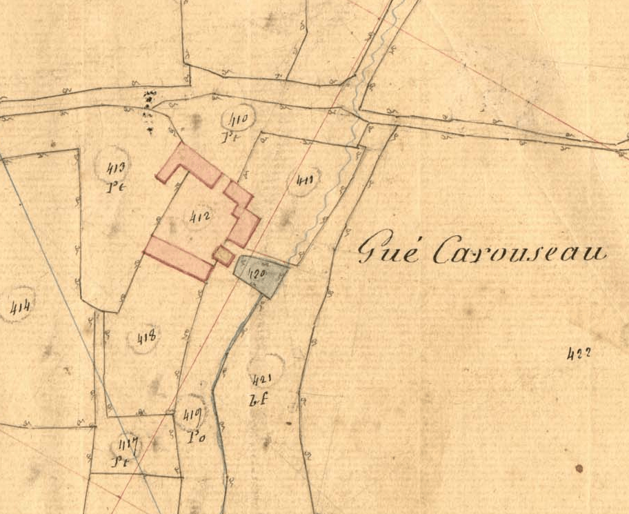 Ci-dessus est l’ancienne métairie noble du Gué Carousseau en Saint-Helen citée pour la première fois en Juillet 1593 ; elle est alors le bien de Guy Bezard et de Denise Obérard sa femme (le ruisseau traversant Gué Carousseau parvenu en les terres du château de la Guerche se jette toujours aujourd’hui dans le ruisseau du Gué Parfond celui-ci alimentant un peu en amont l’ancienne maison noble de Bois-Fougères nommé en 1473 « la Tousche es Russeaux ; ne formant à la Guerche qu’un seul et même ruisseau celui-ci franchissant la route de Dol prend alors le nouveau nom de « Ruisseau Sainte-Susanne »).