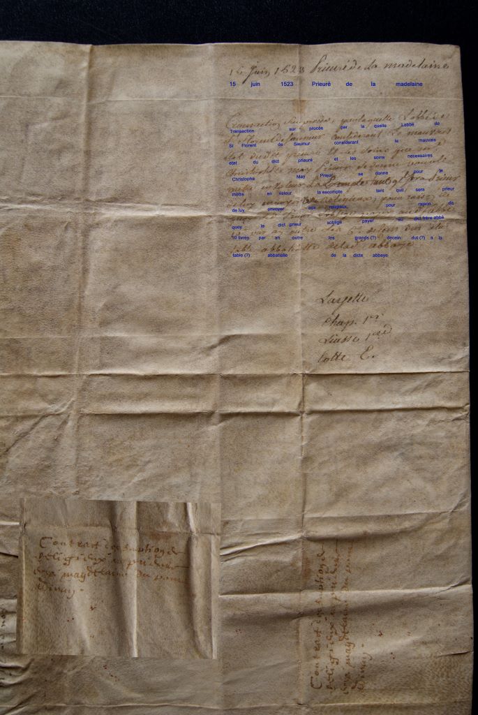 Lequel procès réalisé aujourd’hui entre les dites parties, parce que cela apparaît ainsi, établit ceci : Que le contrat de transaction fait aujourd’hui en la court du Roi, personnellement établi le révérend père Jacques Le Roy soumet que luy et ses successeurs, abbés et sujets laïcs chargés du Temporel de la dite abbaye de Saint-Florent de Saumur, confessent que considérant que le Bénéfice du prieuré du pont était en ruine, que depuis il a été remanié par le dit défenseur prieur Christofle May, que celui-ci a commencer à l’augmenter et à le mettre en valeur, que celui-ci à l’intention de nommer personne pour pourvoir à son entretien, le dit révérend Jacques Le Roy à pouvoir et dispense pour ces réparations le dit défenseur, pour tout le temps où celui-ci sera prieur en ce prieuré, de devoir seulement lui envoyer un religieux, dans un mois ou deux. Celui-ci mettra a exécution la sentence du dit révérend lequel, sur promesse, devra transporter le dit religieux en un endroit où celui-ci souhaitera aller.