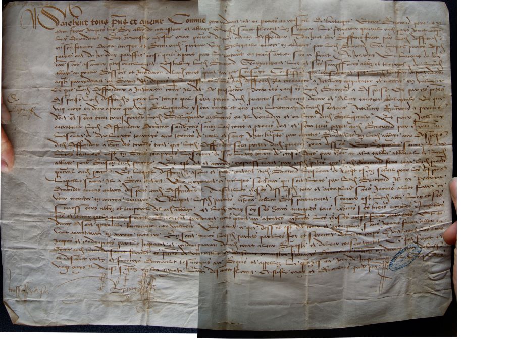 Saichent tous pns et avenir(pns: abrégé de « présent. ..pour le présent et l’avenir…) comme par cy devant ait un proces, au conseil de Bretagne, entre reverend pere cy devant, frere Jacques le Roy, abbe du monastere et abbaye … Sainct Florent lez Saumur, le procureur general au dict pavé (au dit lieu) jouict avecqs luy, demandeur, et maistre Christofle May prieur du pont a Dinan, deffendeur, touchant les res… faict par le dit deffendeur en son fermier davoir accepte et receu au dict prieuré ung relligieux envoye en obedience par le dit reverend lequel proces les dictes parties ont du jourduy, parsse ainsi quil appert par le dict contract en transaction sur ce faict de jourduy en la court du roy moi-même ………personnellement estably le dict reverend soubmectant luy et ses successeurs, abbes et temporel de la dicte abbaye au premier ressort et juridiction de la dicte court ………confesse que considerant que le dict benefice du pont a dinan a este parcydevant en ruyne et que depuis il a este remanié du dict deffenseur, a commancé a icelluy augmenter et mectre en valeur, et que le dict deffenseur a intention nomer il dit de personnes pour … (reconstruire ?) le dict reverent a dispense et par réparation ( ?) dispense le dict deffenseur, pour le temps quil sera prieur du dict prieure, seullement davoir et de luy envoyer religieux et qui un mois ou deux apres que un relligieux y sera envoyé et mis par lexecusion de la dite sentence icceluy reverend a promis doit et sera tenu transporter le dict relligieux ailleurs ou il vouldra et ou lieu du dict relligieux et pour iccelluy. Entretenu, le dict deffendeur, deument soubmis soubz la dicte court a promis doit et sera tenu au dit reverend, par chacun an, la somme de deux livres tournoys aux termes de noel et sainct Jehan Bapte(iste) par moitie rendable en la dicte abbaye aux despens du dict deffendeur, a chaque des termes, tant que le dict deffendeur sera prieur du dict prieure nomme cy dessus, en laquelle somme de dix livres tournoys nest en rien compris la somme de six livres tournoys de rente deue, par chacun an, a la table abbatiale de la dicte abbaye raison du dit prieure et est du et accorde expressement …que le dict reverend fera tenir, le dict procureur en le dict pavé et lequel despens 30 sols et paye contant au dict reverend la somme de vingt et unz sols pour les despens laquelle somme il a receu contant et moyennant quelque sentence qui soit levee par le dict reverend, il ne pourra aucuns autres despens au dict deffendeur, auquelles choses dessus S (sera) tenu et accompli sans jamais aller faire venir encontre en aucune maniere. Obligent les dictes parties chacune declare, seavoir est le dict abbe, luy et ses successeurs abbez et temporel de la dicte abbaye, et le dict May, soit presens avecques chacuns ses biens, meuble et immeuble, pre (présents) et a venir, quelz quilz soinct, renoncent par devant nous quant en a toute chacune a cest faict …. Et au droict …generalle …non valloir et a tout ce que dessus est dit tenir et acomplir sans jamais faire aller ni venir au contraire en aucune manière, en souttements les dictes parties par les foy et serment de leurs corps. Cy fut fait et donné au dict lieu de Saint Florent en presence de venerrable et discret maistre Francois de Montmorency en decret …et de Sainct Quentin et François Denouault tesmoignent ainsi requis et appellez le quinziesme jour de juing lan mil cinq cens quatre vingt troys, ainsy signez en la mynute labbe de sainct Florent, Cristofle May et devant pour…