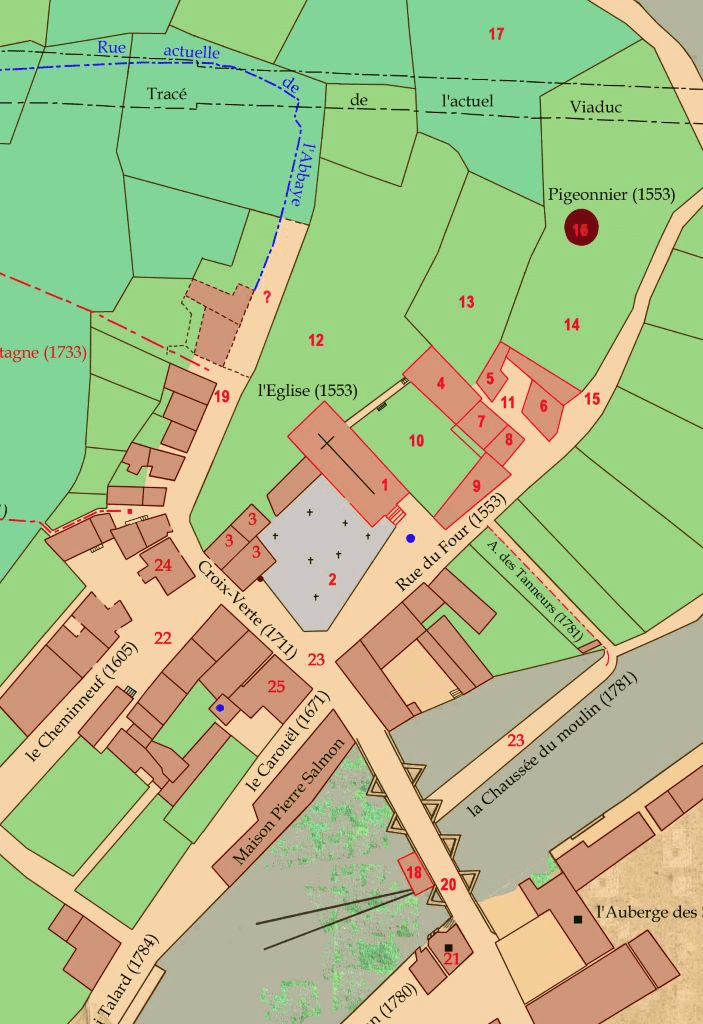 La Maison du prieur est en le n°4 ; ses dépendances jardin compris, hormis l’église et le cimetière, étant en les n° 10-9-8-7-11-5-8-14-16- 13 et 18.