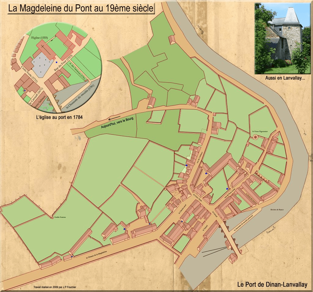 Cependant, peu avant la Révolution, en 1784, le port de Dinan était toujours en pleine transfiguration professionnelle les premières heures du XVIII ayant déjà ici aussi amenées toute une nouvelle classe sociale émergente, classe sociale ouvrière dans l’âme et les sueurs laquelle ici même assistera dès 1736 à la première rénovation des quais du port de Dinan (De part et d’autre de la Rance sera présente au pont à Dinan dès la fin du XVI siècle, et présente tout au long du XVII siècle, toute une bourgeoisie dite de « Robe » laquelle sera citée au travers des BMS de la Magdeleine; celle-ci, multi propriétaires ici même, semble devoir brutalement disparaitre tôt, très tôt, cela dès la première moitié du XVIII siècle, remplacée ici même qu’elle sera par une nouvelle classe sociale, « roturière celle-ci ; cette dernière accompagnera pleinement tout au long de ce même XVII siècle le plein développement économique du port de Dinan/Lanvallay. Ainsi ici même disparaitrons en effet tous les nobles de robes ici même présents hier remplacés qu’ils seront par des marchands de fer, des charrons, des maréchaux-ferrants sur route, des manufacturiers de toiles, des loueurs de chevaux, des rouleurs, des marchands de grains en tous genres, des fabriquant de tuiles ou de bière, moult marchands tanneurs, etc lesquels pour beaucoup s’enrichiront au point d’acquérir à la bougie moults biens confisqués par les Domaines nationaux) .