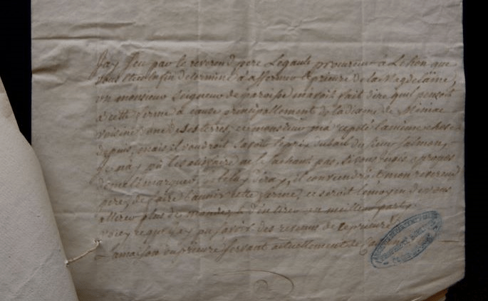 Jay seu par le révérend père Legault procureur à Lehon que vous êtes enfin déterminé à affermer le prieuré de la Magdelaine . Un monsieur seigneur de paroisse m’avoir fait dire quil pensoit à cette ferme a cause principallement de la dixme de Miniac voisine dune de ses terres; ce monsieur m’a repeté la même chose depuis, mais il voudroit savoir le prix du bail du sieur Salmon. Je n’ay pas pu le satisfaire ne le sachant pas, si vous jugés à propos de me le marquer je le luy diray, il conviendroit, mon révérend père, de faire bannir cette ferme, ce seroit le moyen de vous attirer plus de monde, et d’en tirer un meilleur party. Voicy ce que jay pu savoir des revenus du prieuré la maison du prieuré servant actuellement de caserne. Vous pourez statuer sur ce que je vous marque pour prix de votre nouveau bail, quoiquil en soit il peut se faire quil visite les années ne voyant pas d’un égal produit tant pour les rentes que pour les carnets (?) [mot non lisible ici] le moulin est actuellement au chaumage et il y est souvent je ne say si c’est que le sieur Salmon s’est l’affermer trop cher ou quil ne trouve pas de meunier je lay vu devant laisser 150 livres. En attendant vos ordres jay l’honneur monsieur d’être d’un profond respect. Dinan le 9 avril 1762. Votre très humble et très obéissant serviteur. Loyer