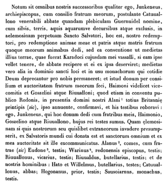 Traduction personnelle : Que tous mes successeurs sachent comment moi, Junkeneus, archevêque, sur les conseils de mes frères, à la demande de Catuuallon le vénérable abbé, j’ai donné une plèbe nommée Guernuidel, avec bois, terres, eaux à l’exclusion des descendes d’eau rapides (de la rivière), en aumônes perpétuelles pour Saint-Sauveur, c’est-à-dire à notre rédempteur, en rançon pour les âmes de mon père et de ma mère et aussi pour les âmes de mes frères ; mais par cet accord la moitié de cette terre appartient à l’un de mes vassaux, Karadoci, et s’il veut lui-même continuer à la tenir il la recevra de l’abbé et ainsi il s’en servira; l’autre moitié restera la propriété du Lieu Saint et pour l’utilisation des moines qui chaque jour prient Dieu pour nous . Et j’ai fait ce don par les conseils et autorisations de mes frères, le vicomte Haimoni il va de soit, et Goszelin, et Riualloni ; ce fut fait au couvent public de Redonis, en présence de notre seigneur Alan prince de toute la Bretagne ; avec son propre consentement je l’ai confirmé et confirmé par ces témoins : moi Junkeneus qui ai fait ce don avec mes frères Haimonio, Goszelinus et Riuuallonus témoins de cette affaire. Cette aumône, si l’un de nos hommes, ou l’un des étrangers, ose l’assaillir , il sera excommunié par le Sauveur du monde à qui elle a été accordée ainsi qu’à tous les saints et par mon autorité il sera excommunié. Alan le comte avec son frère Eudes, témoins ; Warinus évêque de Rennes, témoin ; Riuuallonus vicaire, témoin ; Riuuald, bouteiller, témoin ; et nos hommes : Hato et William, bouteillers, témoins ; Gatuuallonus, abbé ; Hogan, prieur, le témoin ; Sausoiarnus, moine, témoin.