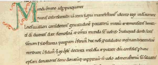 Traduction personnelle : Cette charte indique que Cunatam, fils de Tiarnan, a remis un homme à Saint Sauveur, nommé Martin, le livrant entre les mains de l’abbé Conuuoion pour la paix, pour ne pas être l’objet d’une enquête avec la publication de toute sa méchanceté qu’il avait eu envers tous les hommes de Saint-Sauveur et les moines de Redon, et ce ne sont que quelques unes de ses crimes : un homme nommé Rithoiam a été pillé et il y a un temps ses vaches et cochons ont été volés, et en un autre lieu un cheval et une jument également ont été volés, et il a fouetté d’autres hommes, et à fait une multitude d’autres crimes que énumérer la liste serait long : Alors il livra l’homme susnommé que les moines de Redon posséderont pour toujours, à la fois lui même et sa semence, sur celui-ci nul impôt et aucun tribut par quel homme que ce soit sous le ciel, sauf le susdit Saint-Sauveur et les susdits moines. Et il (Cunatam) a donné deux fideiussores (2 hommes se portant pour lui garants), Uuetenoc et Abraham, pour la sécurité des susdits hommes (les moines), et celui-ci après jura en nul autre endroit commettre crime envers les susdits moines, et ni envers leurs hommes. Fait en l’église de Bain le jour du sabbat (samedi), II odes, calende de juillet, sous la domination de Salomon de Bretagne et de Courantgeno évêque de la cité de Vannes; en présence de nombreux hommes nobles à qui sont ces noms : Uuorgouan, prêtre, témoin ; Ninan, prêtre, témoin ; Hinualart, témoin; Conan, testis; Ratfred, témoin; Ratuili, témoin; Gosbert, témoin; Arthueu, témoin; Uurgoion, témoin; Iarncant, témoin; Catlouuen, témoin; Iudre, témoin; Ranauuart, témoin; Liosoc, témoin.