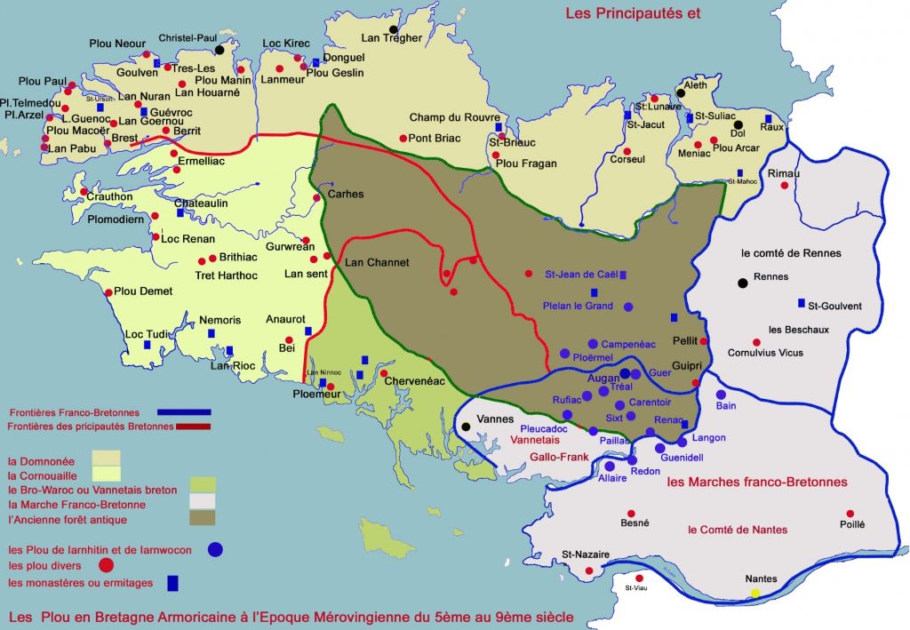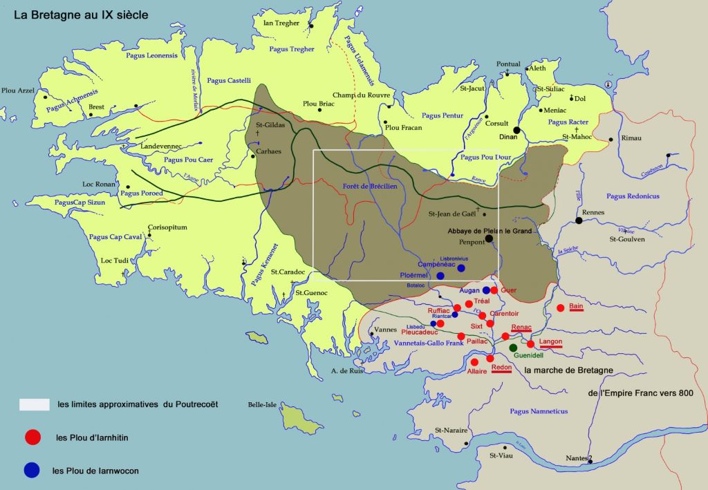 Il est intéressant de remarquer, ici même, que l’ensemble des plous ou « paroisses » relevant de la seule famille du susdit machtiern « Iarnhitin », chef de tout un ensemble de plèbes en 780, étaient tous situés le long de la grande Marche Bretonne » et cela en le Pays oriental de Vannes lui même.