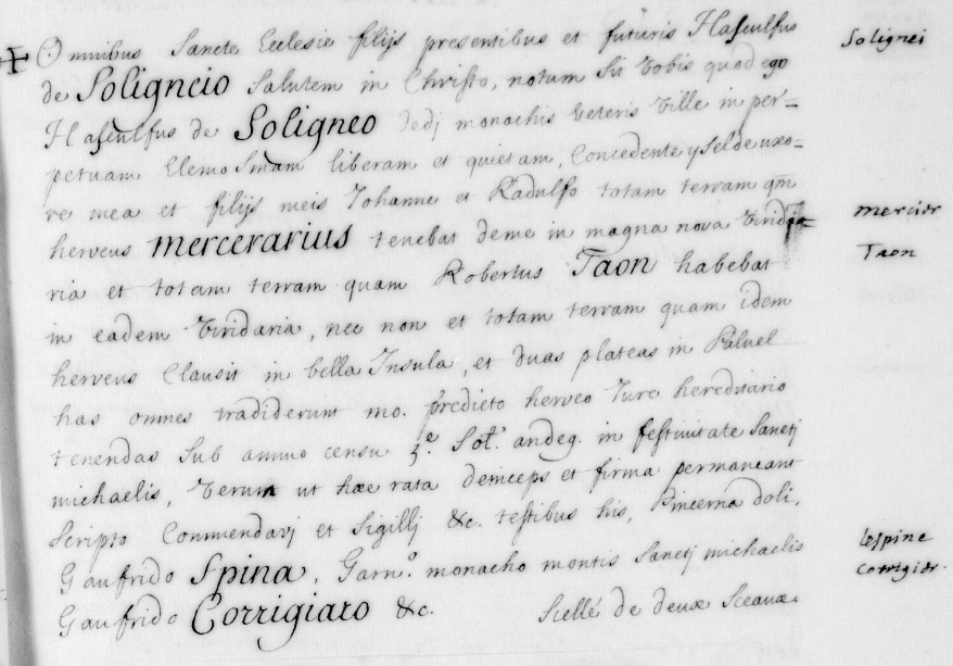 Moi, Hasculfus de Soligné, avec le consentement de mon épouse Yselde et de mes fils Jean et Raoul, j’ai donné aux moines de Vieuville, en aumône perpétuelle, libre et franche, toutes les terres que tenait de moi Hervé Mercier dans la Grande Nouvelle-Vergée (Magna nova Viridaria), ainsi que toutes celles que Robert Faon possédait dans cette même Vergée, et encore toutes celles qu’Hervé avait closes dans l’Isle-Belle (Bella Insula), ainsi que deux emplacements à Paluel.