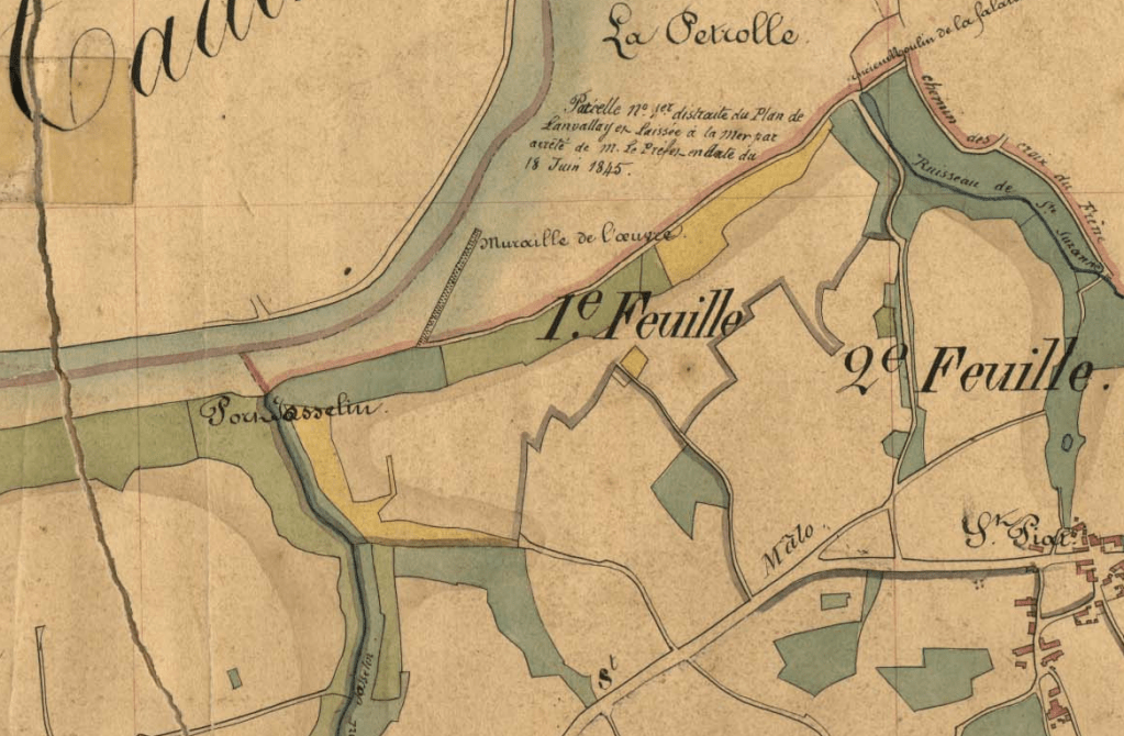 Biens en indivis entre les communes de Saint-Solen, de Pleudihen et de Saint-Helen, et de Lanvallay exceptionnellement, les seconds plans cadastraux de 1844 assoient ici même en cet endroit une grande digue artificielle coupant en presque sa moitié la rivière et retenant de ce fait ce même grand marais tant nourricier et propice à la terre. Ce marais coupé et recoupé en grandes tranchées pour les besoins de l’extraction de la dite marne on l’appelait aussi «la Muraille de l’œuvre »; je vois sur cette muraille toujours ici en pensée des charrettes tirées par leurs propres chevaux.