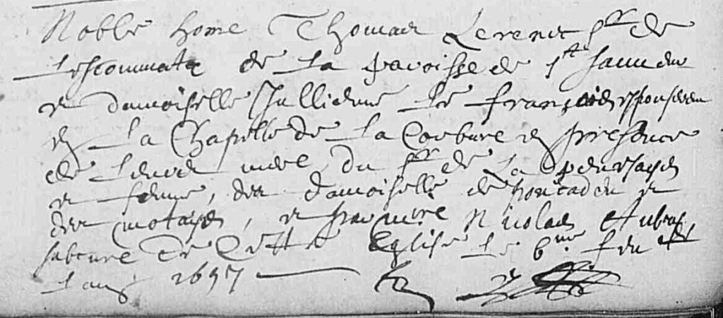 Acte de mariage réalisé le 15/02/1657 en la chapelle de la Courbure.