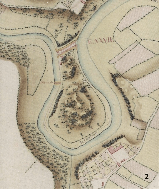 Sur les seconds plans cadastraux de 1844, en ce même endroit de la Courbure, cette exploitation est en effet très clairement par écrit indiquée de part et d’autre de la rivière ; cela n’est pas du tout le cas il est vrai pour les premiers plans napoléoniens de 1811.