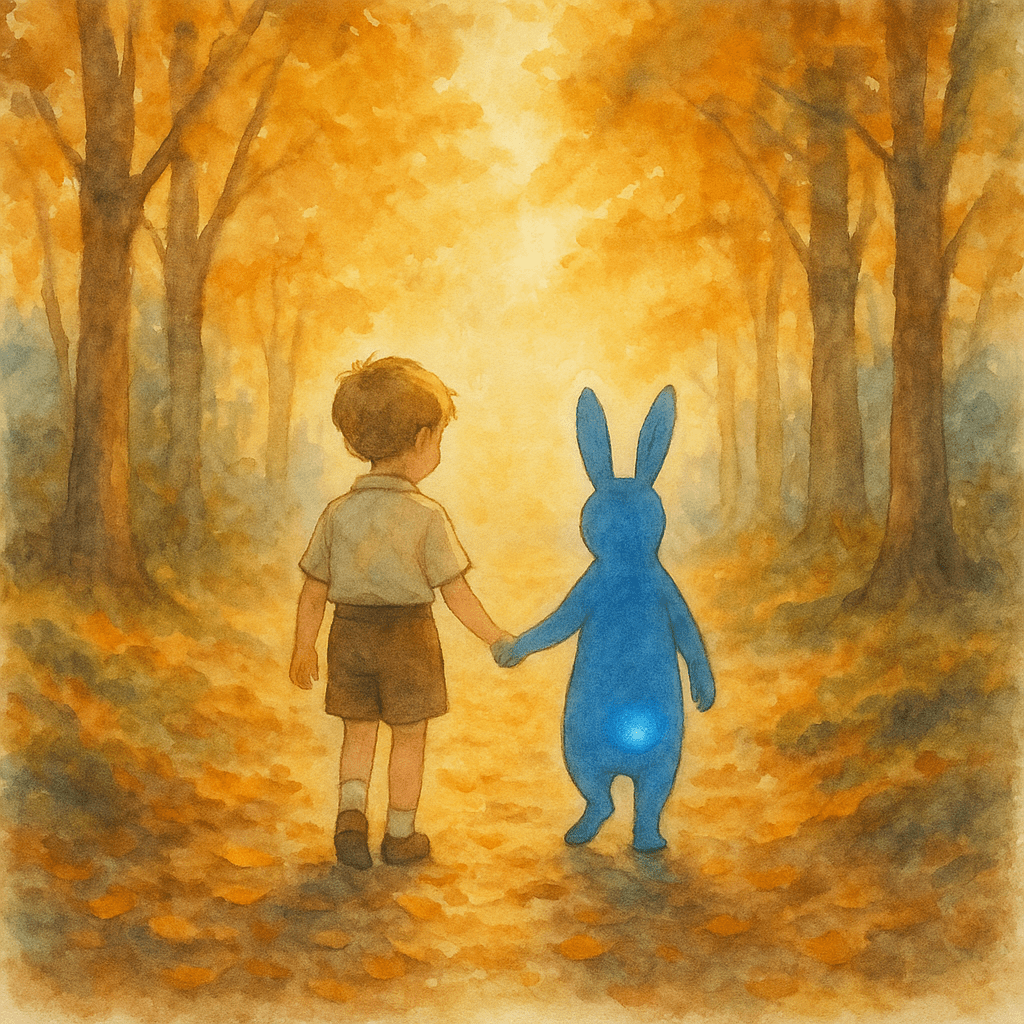 – Sous les grands arbres d’automne, un enfant et un lapin bleu avancent d’un même pas.
