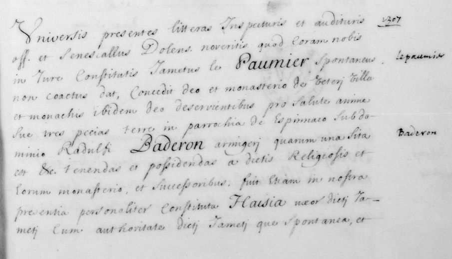 Universis presentes litteras inspecturis et audituris off. et senescallus Dolensis noveritis quod coram nobis in jure constitutis Jametus le Paumier spontaneus non coactus dat, concedit Deo et monasterio de Veteri Villa et monachis ibidem Deo servientibus pro salute anime sue tres pecias terre in parrochia de Espiniaco sub dominio Radulfi Baderon armigeri, quarum una sita est etc., tenendas et possidendas a dictis religiosis et eorum monasterio et successoribus. Fuit etiam in nostra presentia personaliter constituta Haisia uxor dicti Jameti cum auctoritate dicti Jameti que spontanea et non coacta confirmat et ratificat donationem predictam et in primis renuntiavit coram nobis omni juri dotalitii. Anno Domini 1307.