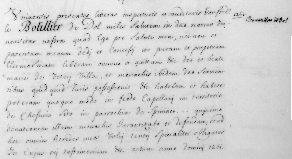 Moi, Geoffroy le Bouteiller de Dol, chevalier, fais savoir que, pour le salut de mon âme et de celle de mes parents, j’ai donné et concédé en pure et perpétuelle aumône, libre et franche, à Dieu et à la bienheureuse Marie de Vieuville, ainsi qu’aux moines qui y servent Dieu, tous les droits et possessions que j’avais ou pouvais avoir de quelque manière dans le fief du chapelain, situé sur le territoire de la Chesnaye, en la paroisse d’Épiniac.