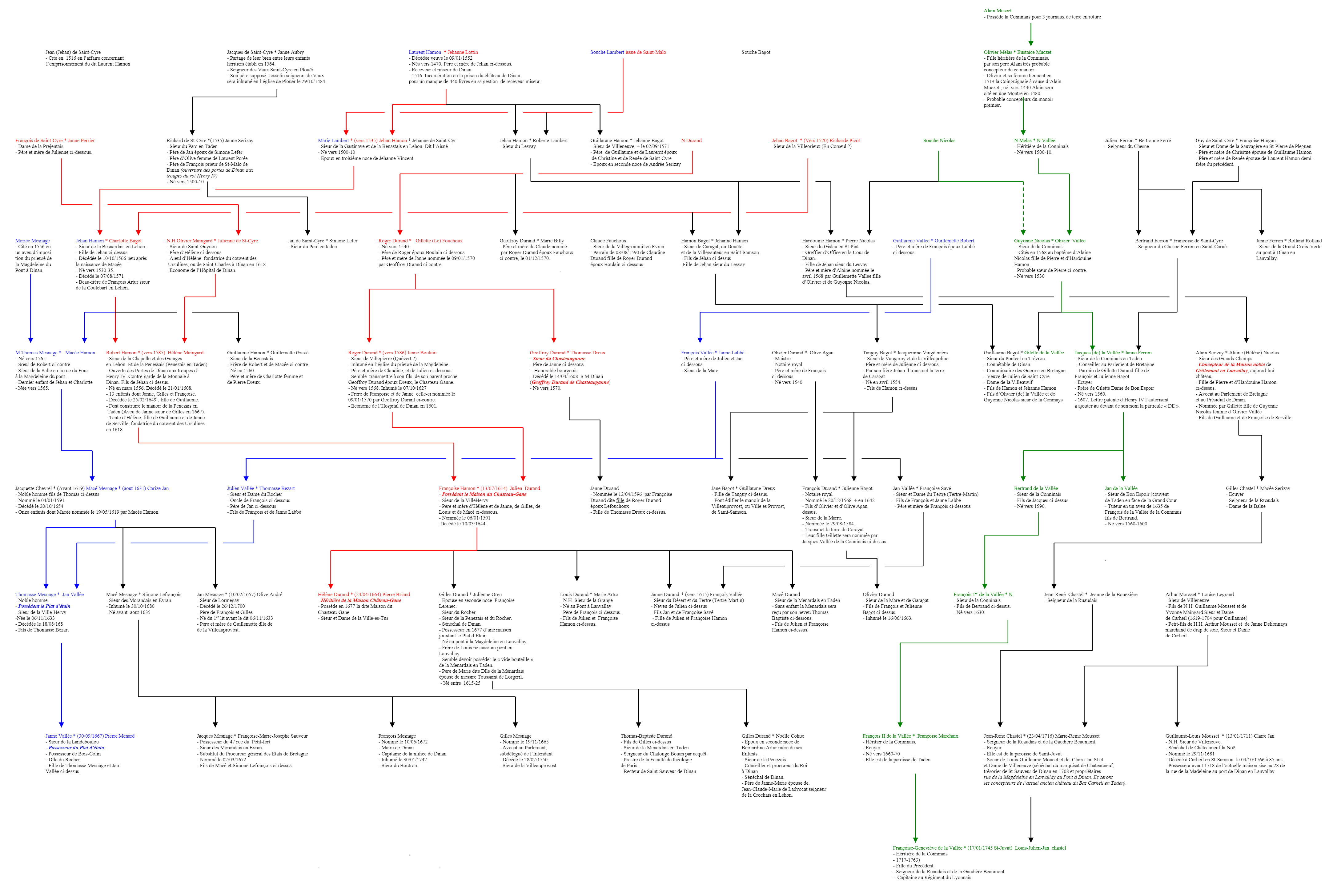 Nous avons ainsi chronologiquement présentés : N.Melas épouse de N.Vallée ; Guyonne Nicolas épouse d’Olivier Vallée (sœur de Pierre Nicolas sieur du Gislaux en saint-Piat) ; Janne Ferron épouse de Jacques de la Vallée (Frère de Gillette épouse de Guillaume Bagot) ; Bertrand de la Vallée (Frère aisné de Jan de la Vallée Sieur de Bon Espoir en Taden) ; François 1er de la Vallée ; Françoise March(a)ix épouse de François II de la Vallée ; et enfin Françoise-Geneviève de la Vallée épouse de l’Ecuyer Louis-Julien-Jan du Chastel.