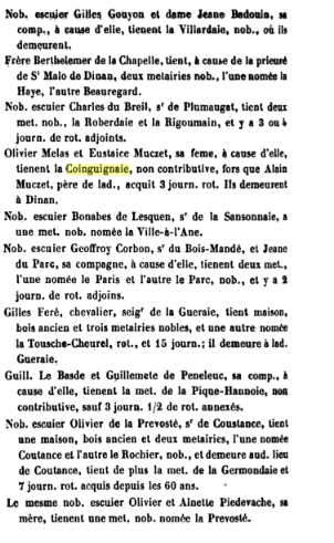 En cette même déclaration, et cela à l’inverse d’autres teneurs de fiefs, il ne sera cependant pas dit d’Olivier qu’il était « Ecuyer » ; Olivier et sa femme demeurant à Dinan, le manoir premier de la Conninais en effet ne semble alors pas devoir encore exister …Ollivier Melas et Eustaice Muscet, sa feme, à cause d’elle, tienent la Coinguignaie, non contributive, fors que Alain Muszet, père de ladite, acquit 3 journaux. rot. Ils demeurent à Dinan…