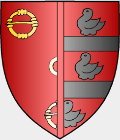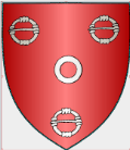 Ces Armoiries sont : De gueules à trois fermails d’argent, un annelet de même en abîme.