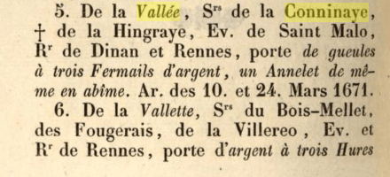 Les « De la Vallée de la Conninais », ou « De la Conninaye », porteront toujours pour Armoiries en 1674 ces 3 fermails accompagné de leur anneau en abime (Mémoires sur l’état du clergé et de la noblesse de Bretagne » écrit en 1691 par monsieur Toussaint de Saint-Luc).