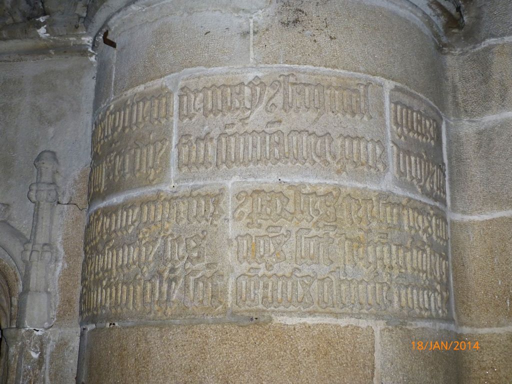 L’une, au nom de Rohin de Dinart et non datée, comprend des Armoiries étranges lesquelles représentent un sablier percé d’une épée et contenant en son centre un cercle, le tout accompagné d’une comète avec sa traine venant mourir au pied d’une croix surmontant le dit sablier. Une seconde pierre tumulaire, datée de 1648, contient seulement les noms gravés de Pierre Lechat et de Briande Lerouy, tous deux tailleurs de leur métier (Nous rencontrons souvent, dans les vieux livres, l’écriture de Dinart pour Dinard).