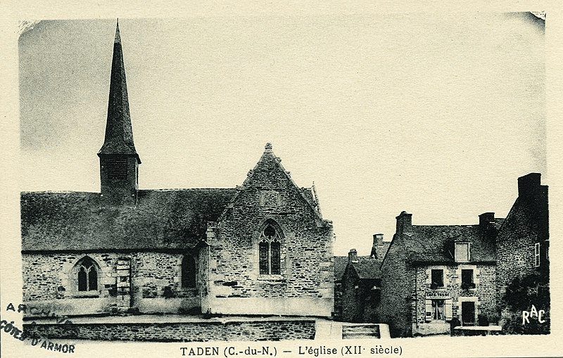 La paroisse de Taden, et cela au travers de son église, sera citée dès l’année 1163 puisqu’en cette même année l’Evesque de Saint-Malo mettra un terme à un différent judiciaire, différent ayant hier opposé son prédécesseur en cette même paroisse aux moines de Marmoutier. Pour l’Histoire en l’année 1378 sera seigneur de cette paroisse Eon de Beaumanoir ce fait étant en effet attesté par un « différent » l’ayant opposé à Jeanne de Navarre, Vicomtesse de Rohan par son époux [Pour Eon en vérité cela serait très probablement une erreur de la part de la plupart des historiens ayant avancés cet épisode; en vérité il s’agirait plutôt de la paroisse de CADEN en Sarzeau, proche de la Roche-Bernard, paroisse en ce temps déposée il est vrai entre les mains d’Alain de Beaumanoir et d’Olive du Val tous deux parents de Jehanne de Beaumanoir. Celle-ci, prenant pour époux Amaury Eder, apportera ainsi son nom propre à cette famille déjà tant seigneuriale. Se rapprochant de St-Brieuc pour s’asseoir, ou pour s’établir, en les terres de son père Pierre Eder, Amaury et Jehanne prendront possession du premier chasteau du Leslay proche de Plouvala bien seigneurial lui aussi relevant de son père. Ainsi la seigneurie du Leslay Eder deviendra la seigneurie de Beaumanoir-Eder. Cette famille, ou cette branche des Beaumanoir, plus tard sera en possession du chasteau de Beaumanoir en Evran cousine qu’elle était de la branche des Beaumanoir du Besso. Bref Taden pour nous n’a probablement jamais eu pour seigneur Eon de Beaumanoir une confusion ayant très tôt été faite entre TADEN et CADEN . Les Beaumanoir-Eder cependant vont se rapprocher un peu plu tard beaucoup plus près de Taden, à Plouer exactement, quand Perrine Eder, petite-fille du dit Pierre susnommé, prendra pour époux Jéhan de Saint-Pol, ou Saint-Paul, alors lui, de son état, seigneur de Plouer].