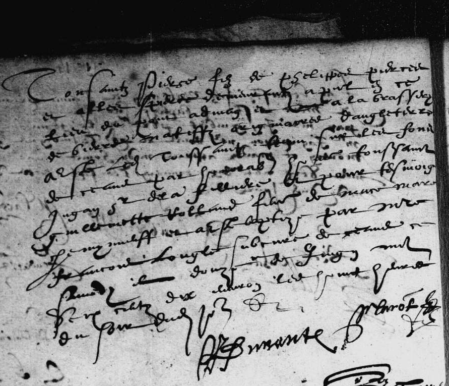 Signent cet acte : Toussaint Jugan sieur de la Fillière, époux de Janne Lerenec ; Guillemette Rolland femme de Macé Marot sieur du Cheminneuf; Ollivier Aubry ; Josselin Lechapellier sieur du Cuccilé époux de Janne Lerenec tous deux possesseurs en le bas de la rue du Petit Fort de l’hostellerie des Trois rois ; Guillaume de Serville ; Jan Aubry ; Leforestier ; Pierre Rolland frère de la dite Guillemette Rolland ; R. Durant ; etc.