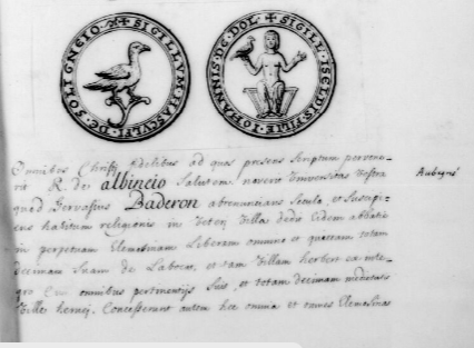 Omnibus christi fidelibus ad quos presens scriptum pervenerit R.de Albineio salutem. Noverit universitas vestra quod Gervasius Baderon ab renuncians seculo, et suscipiens habitum reliogionis in Veteris villa; dedit eidem abbatie in perpetuam elemosinam liberam ommine et quietam totam decinam suam de Labocat , et tam villam Herbert ex integro cum omnibus pertinentiis suis et totam decimam medietatis Ville Hervei. Concesserunt autem hec omnia et omnes elemosinas de feodo suo videlicet prata de Travidal et quartam partem Harelterie, et omnes alias quas habebant monachi de feodo ancessorum suorum , Joannes fratre ejus et Nicolaas soror eorum, et Johannes de Moscon maritus ejus, et omnes pueri ipsius Nicholae. Hujus donationis testes sunt M.abbas ; G.Prior; Denoales et R. de Passibus monachi; G.Barbot; R.Bardol et R. de Combor milites et multi aliis hoc autem donum quia de feodo meo erat, et volui fieri firmum et in perpetuo permanserum. Concedente uxore mea. M. sigillismei defensione roborari.