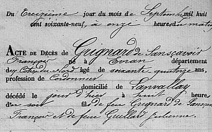 – François Grignard de Sansçavoir nommé à Evran le 14 fructidor de l’an II; cordonnier de son état il décèdera à Lanvallay le 12/09/1869 (Sansçavoir pour Champsavoy ; la matrice cadastrale de 1811 de Lanvallay l’assoit en la maison de la Cour de Bretagne en tant que CORDONNIER ; oncle du dit Auguste Dubée François ne semble pas avoir été marié laissant en effet pour héritier de sa maison sa sœur et son fils, son dit neveu Auguste).