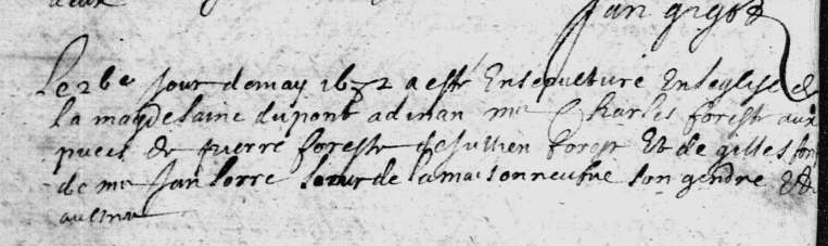 Acte de baptême de Perrine Forest fille de Pierre Forest et de Janne Desouhier nommée sur les fonds baptismaux de l’église de la Magdeleine par Messire Pierre Tranchemer. Né vers 1570-75 Pierre Forest, ici cité, ne pourrait t’il pas être le propre aïeul de notre Charles Forest fils des dits Pierre et de Julienne Bréginal tous deux nés vers 1600 ?