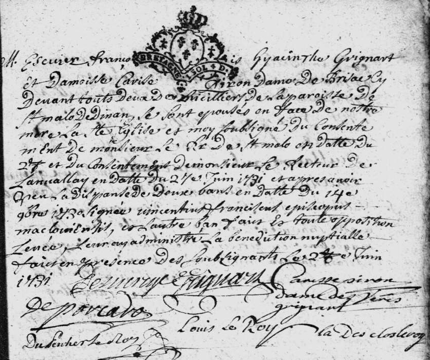 Le susdit François, fils de Jacques Grignard, sera le père de François-Hyacinthe Grignard des Verries celui-ci épousant Carize Piron alors veuve de Richard de Brissac ; né vers 1660 lors de leur deuxième union à tous deux, union célébrée à Lanvallay le 27/06/1731, tous deux étaient alors domiciliés à Dinan en la paroisse de Saint-Malo.