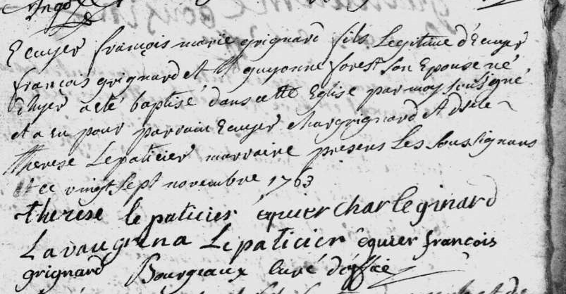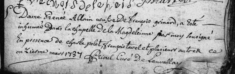A l’inverse son fils supposé, né vers 1690, François Grignard époux de Renée Allaine, lui sera établi à la Magdeleine avant 1716 année du baptême de sa fille, Anne-François ; le hasard de la vie voudra que François décède un peu moins de trois mois après le remariage de son père, le susdit François-Hyacinthe).