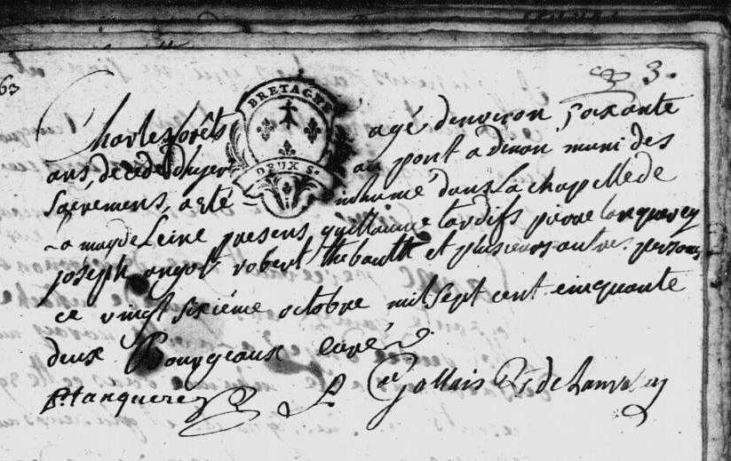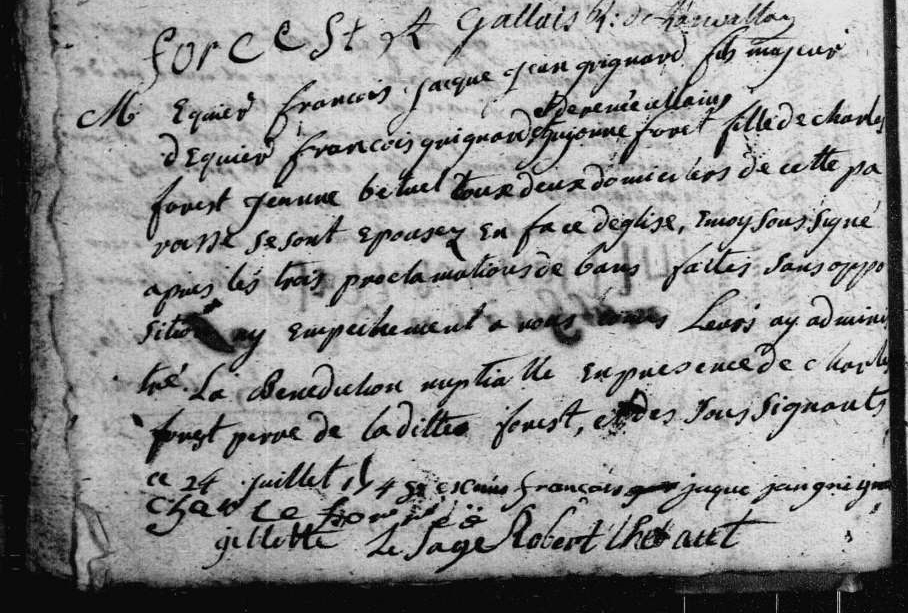 Ainsi, parmi leurs 16 enfants, Gilles Forest l’aisné sera nommé en 1648 par Gilles Ermel, son aïeul supposé, celui-ci aussi « maistre boulanger »; ainsi Denise née en 1651, sera baptisée par Pierre Sanson lui aussi « Maistre boulanger »; ainsi Julien, né en 1654, sera nommé par Julien Faïns lui aussi « Maistre boulanger »; ainsi Noëlle, née en 1663, sera nommée par Josselin Briand lui aussi « Maistre boulanger » mais aussi par le femme de Nicolas Dutertre celui-ci également « Maistre boulanger ».