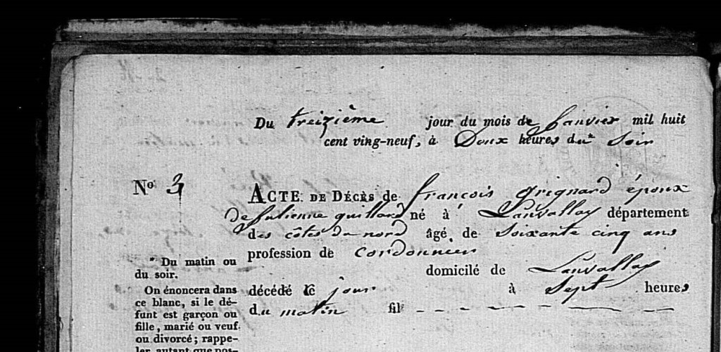 Acte de décès de l’Ecuyer François-Marie Grignard époux de Julienne Guillard, décédé à Lanvallay, dit de son métier « Cordonnier » (Seront témoins lors de la déclaration de son décès ses deux gendres, à savoir Pierre Dubée et Laurent Danjou son propre fils François, lui aussi cordonnier, n’y étant pas présent).