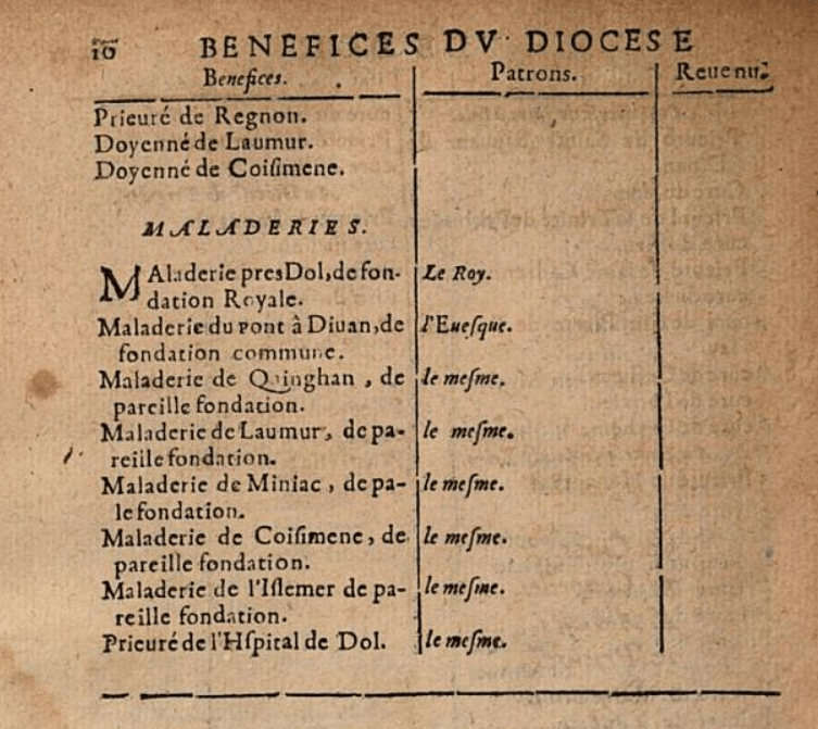 Extrait du Pouillié général écrit par Gervais Alliot citant la présence d’une maladrerie au Pont à Dinan en 1648.La première citation de la présence d’une léproserie ou Maladerie au pied du prieuré sera faite en l’année 1219 lors d’un désaccord ayant opposé en le tout début du XIII siècle et Olivier de Coëtquen et le prieur du prieuré (Probablement Even ici en mandature en cette même année).