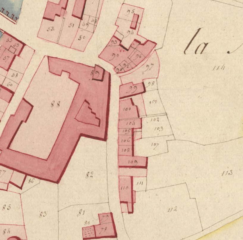 Ce corps de bâtis est l’ anciens numéro cadastral n°99 de 1811 le parking devant son entrée étant lui le n° 97 ; cet ensemble depuis sa première heure à toujours eu pour voisin immédiat la dite Maison de la Cour de Bretagne bien en 1811 du dit sieur François Grignard de Sansçavoir (bien en 1811 de la Veuve Baron, puis en 1837 du sieur Pierre Follen, la surface propre à ce parking, idem pour le jardin le prolongeant jusqu’à la Vallée de Bretagne, sera lui aussi acquis probablement par François Grignard lorsque celui-ci se portera acquéreur de ce même ensemble de bâtis. Avant de devenir le bien du dit François Grignard l’ensemble de ce bâti quant à lui en 1811, et « toujours » en 1821, sera le bien de Pierre Salmon époux de Perrine Busson avant d’être celui, en 1829 de madame Françoise Lorre.