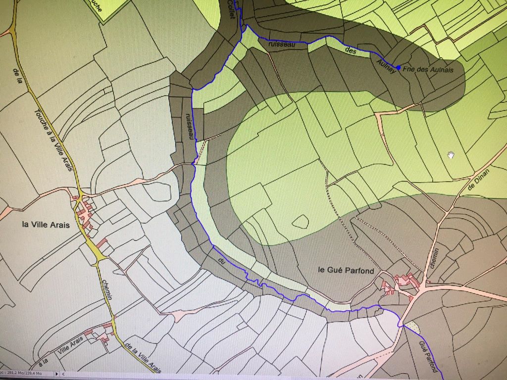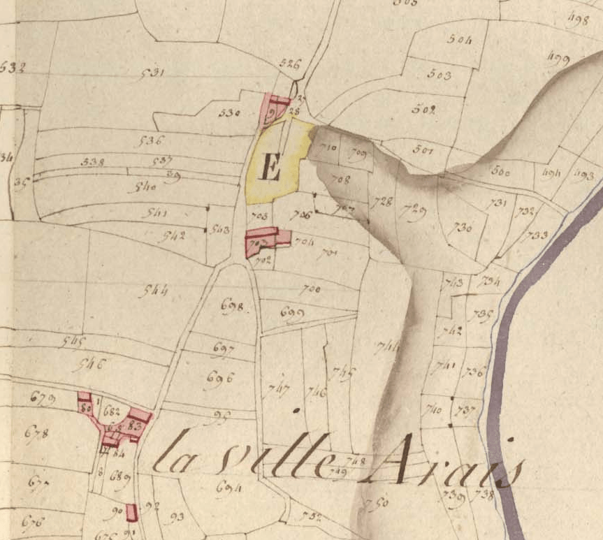 Séparant les parcelles 500-494-493-731-732 et 733 le petit chemin vicinal descendant depuis la Ville Arais sur le Gué-Parfond en 1811 est déjà existant.