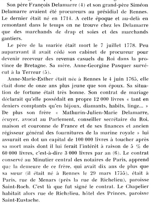 Apparaissant à la fin du XVI siècle les Lechapelier obtiendront enfin leurs propres lettres de noblesse en octobre 1779; cette famille s’éteindra cependant à Paris, la tête coupée par la Guillotine ; Isaac-René-Guy Lechapelier montera en effet les marches de l’échafaud le 22 avril 1794 avec grand calme il parait. Sa tête roula au sol au côté de celle de Chateaubriant le propre frère du grand écrivain breton ; la même charrette de la mort, ce jour là, de nouveau transporta du beau monde.