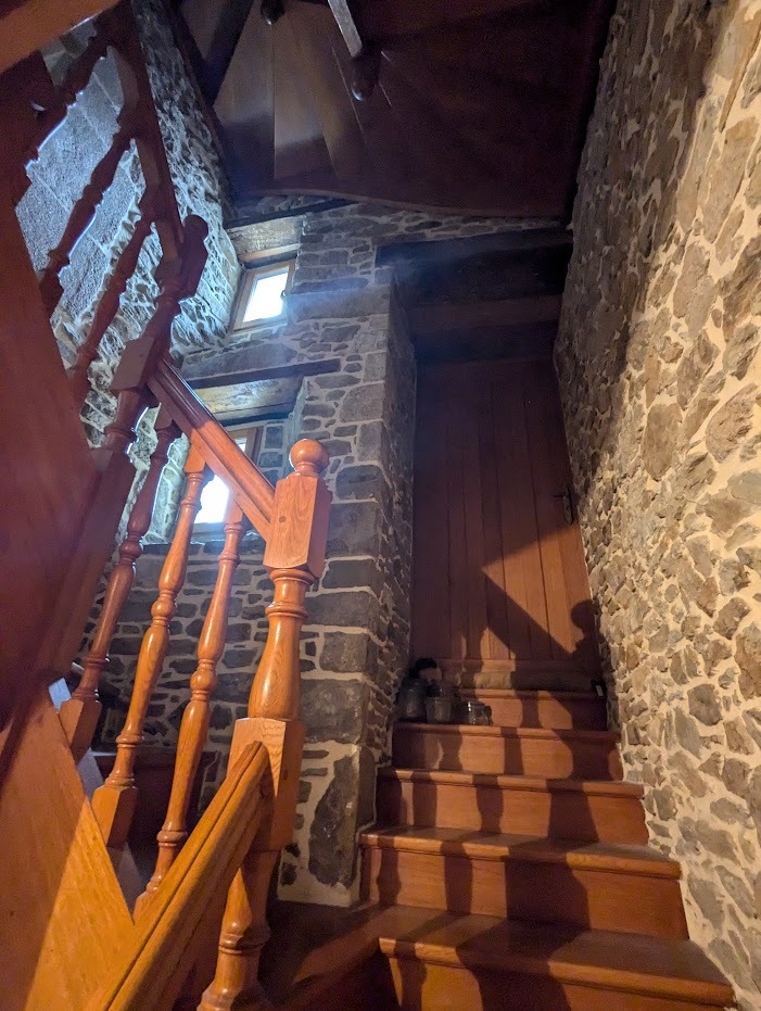 Le très bel escalier actuel, en bois, est lui aussi du XX siècle ; au RDC il délivre donc aussi accès au susdit grand agrandissement réalisé à nord (agrandissement réalisé donc en 1753 et restructuré au XIX siècle) ; en le premier virage de l’escalier l’actuelle ouverture, ouverture desservant elle aussi le même grandissement en son propre étage, est du même XX siècle.
