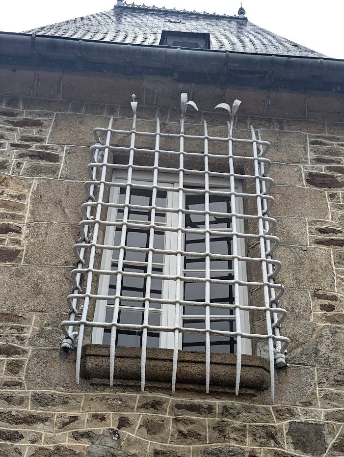 A l’extérieur, à orient, côté cour, la fenêtre de la grande chambre du premier étage possède une magnifique grille de défense celle-ci possédant trois très belles fleurs de lys ; la corniche et la souche de cheminée sont en pierres des faluns.