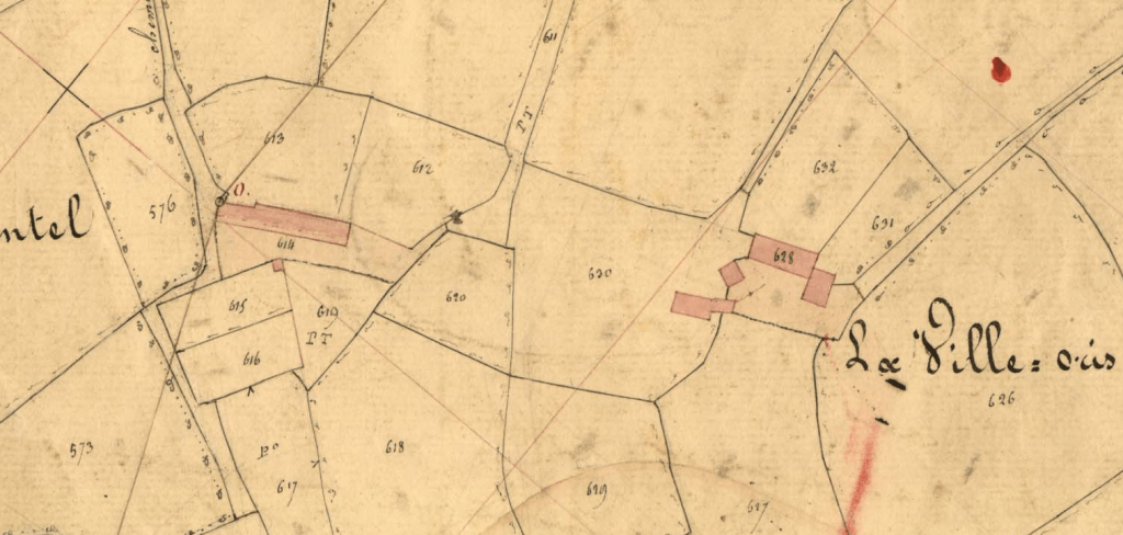 – La Vallée du Devant ayant ses fossés et talus au midi ; joignant d’orient le chemin du Pavillon et du couchant à la terre de Fromentel et du nord aux bâtiments et cour de la ferme. Plantation, culture et pâture pour 68 ares.