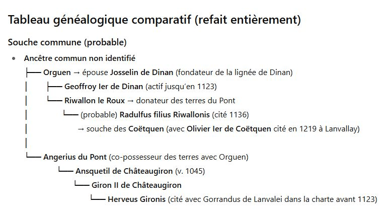 Ces deux lignées seraient donc issues du même tronc Dinan, et se rejoignent sur le plateau. À la fin du XIIᵉ siècle, Alain de Lanvallay et Olivier de Coëtquen sont véritablement « petits-cousins ».