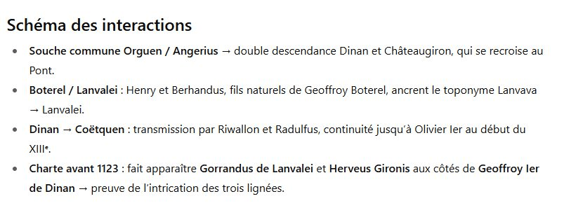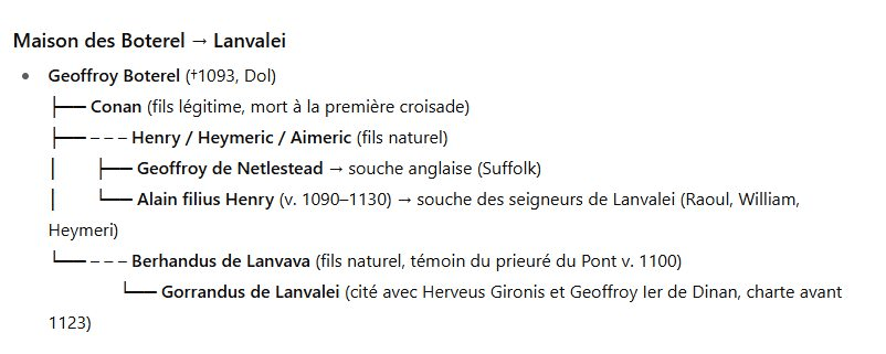 - Alain fils d’Henry, fondateur de la seigneurie de Lanvallay, hérite à la fois du rameau Boterel (via son père Henry, frère de Berhandus de Lanvava) et peut-être de droits issus de son beau-père supposé, Riwallon le Roux.