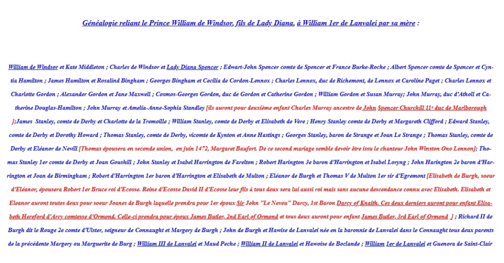 De cette longue chaîne descend Lady Diana Spencer, et, par elle, ses fils le prince William et le prince Harry, héritiers de la maison de Windsor.