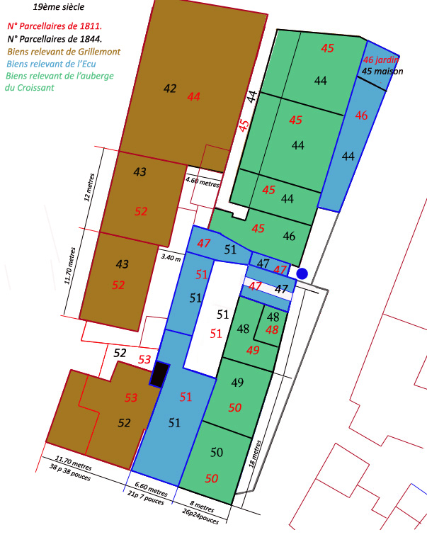 Parcellaire des Implantation de l’ancien logis de Grillemont, de la maison de l’Ecu et de l’hostellerie de Tourandel alors nommée « hostellerie du Croissant ».