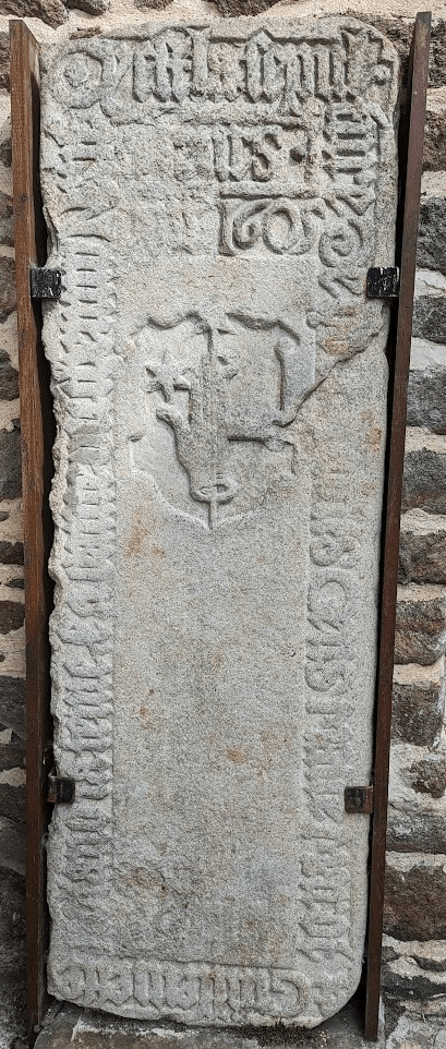 Macé et Guillemette feront réaliser cette pierre tombale devant recouvrir leur sépulture au cour de l’année 1605 cette date terminant la phrase sculptée « SANS HOIRS ces deux mots signifiant que sous cette pierre eux deux seulement devaient reposer, eux deux sans aucun de leurs propres enfants à leur côté ( « hoir » signifiant toute personne relevant d’une même succession, soit les héritiers directs »).